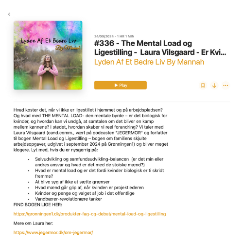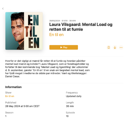Vil du gerne holde et arrangement i din virksomhed eller din organisation, om mental load? Jeg afholder både workshops, hvor vi konkret arbejder med at bevidstgøre og tale om mental load og jeg holder foredrag. Jeg kan afdække både mental load i familielivet og den skævvridning af mental load, der opstår på arbejdspladser.